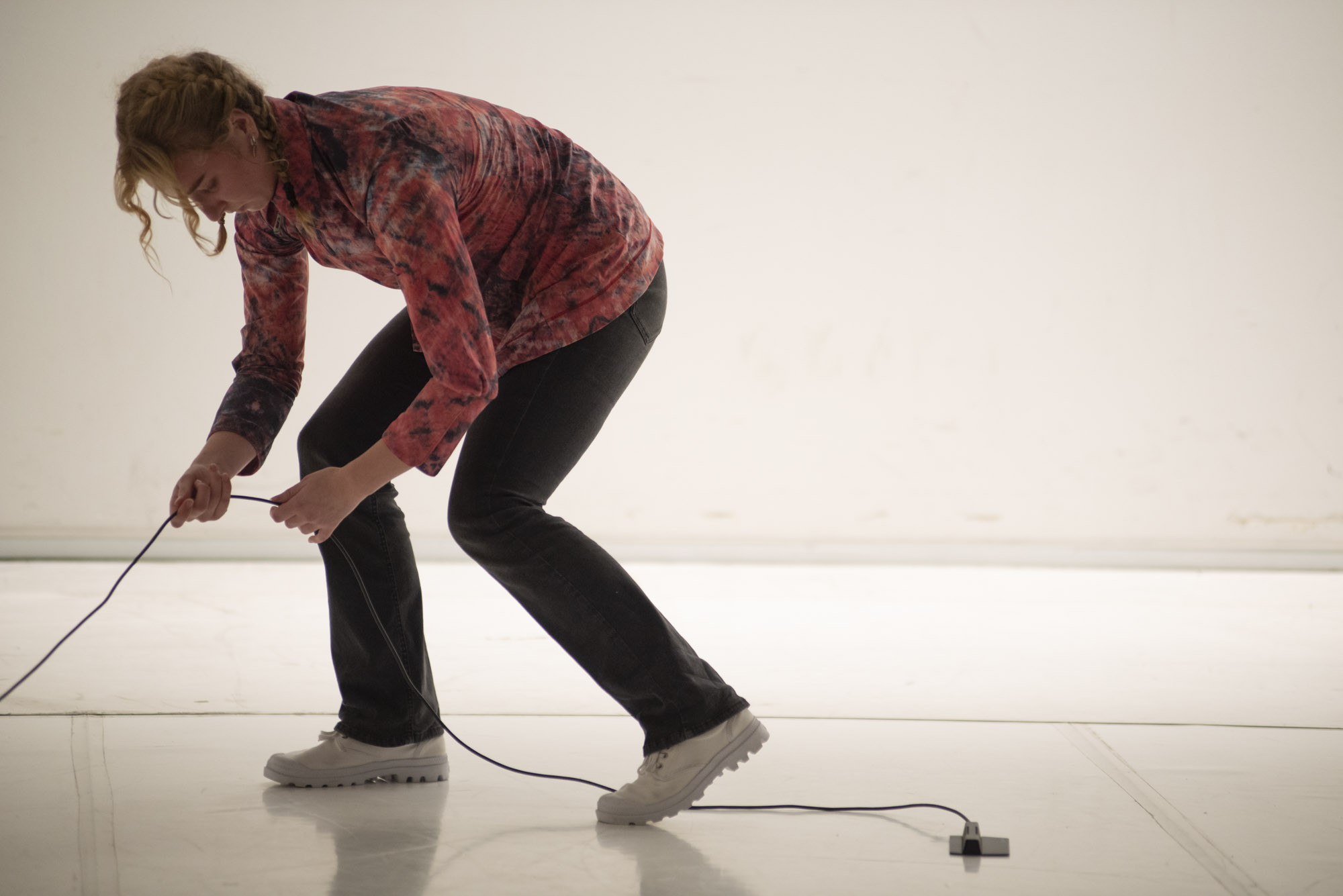 The performance unfolds with the lyrics of Ivor Cutlers “Beautiful Cosmos’ framing the activity happening before us. The performers observe each other and the space and act accordingly. Surfaces are tapped, shaken and stroked; walls floors, bodies and chairs. Dances are observed and joined in. The floors is explored and upended. This unfixed surface takes on a life of its own; a river, a landscape or something wet takes the audience to many different places. The dance floor is used like clay allowing different textures of dance to emerge; slippery dancing, on the edge dancing, shifting dances and falling dances. In this open structure the performers observe and join in on different ways of being on, in and with the floor and each other. Through playing we see the performers navigate how these different tasks demand them to work individually and collectively to connect to notions of ground.